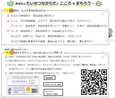 埼玉県県民生活部より、県教育局を通じて「アイリスホットライン」についてお知らせがありました。必要に応じてご活用ください。